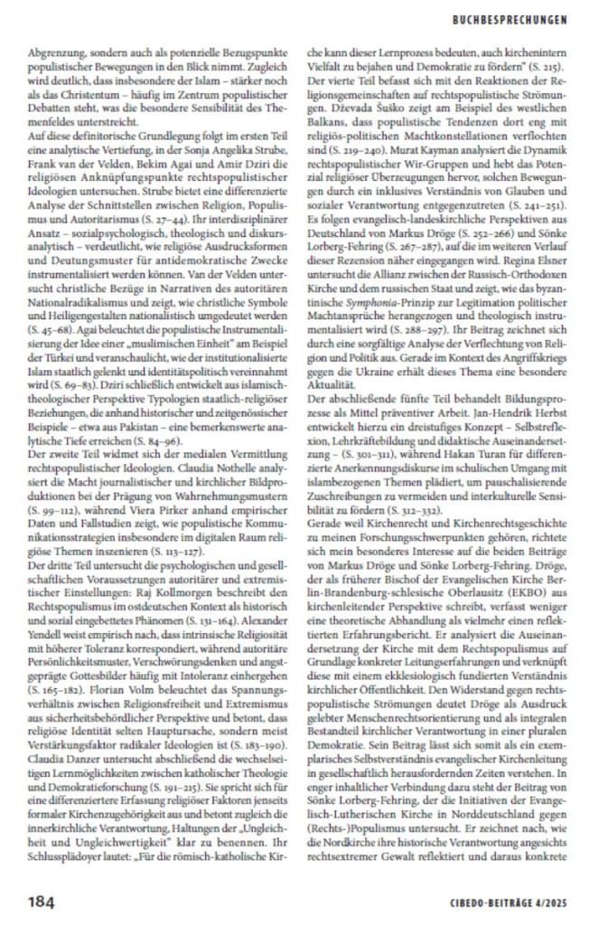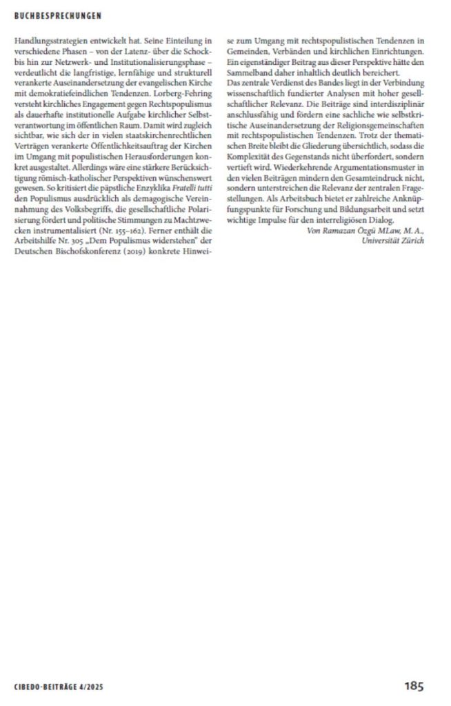 Aus meiner Sicht stellt der Sammelband einen wichtigen Beitrag zur Analyse der Wechselwirkungen zwischen Religion und Rechtspopulismus dar. Er verbindet wissenschaftliche Analyse mit gesellschaftlicher Relevanz und bietet zahlreiche Anknüpfungspunkte für Forschung, Bildung und interreligiösen Dialog.