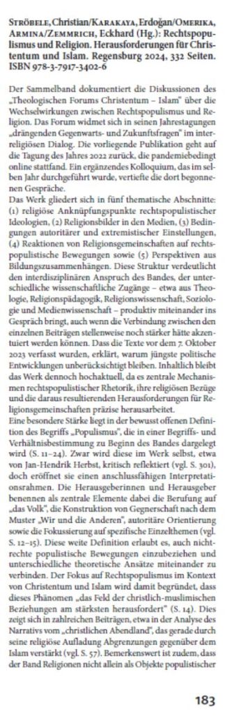 Kürzlich ist meine Rezension des Sammelbandes Rechtspopulismus und Religion. Herausforderungen für Christentum und Islam erschienen, herausgegeben von Christian Ströbele, Erdoğan Karakaya, Armina Omerika und Eckhard Zemmrich (Regensburg: Friedrich Pustet, 2023).